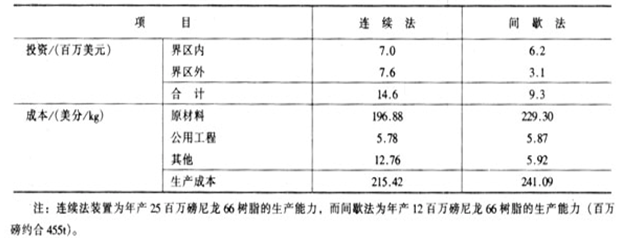 从上述表中数据可以看出:两种方法的原材料消耗和公用工程费用相差不大,间歇法稍微高一点。间歇法原料费用高的主要原因是间歇法所用的尼龙66盐是用甲醇为溶剂制备的,而连续法是水为溶剂制备的63%水溶液,直接用于缩聚反应。两种方法的投资和生产成本比较列入下表