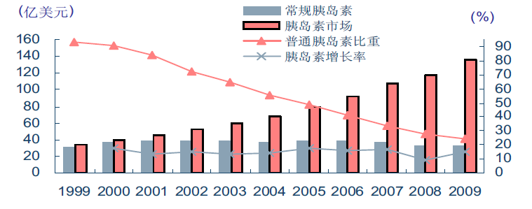 胰岛素从技术水平上来看,大致经历了三代:动物胰岛素(低端,一代胰岛素),重组人胰岛素(终端、二代胰岛素)和胰岛素类似物(高端、三代)。