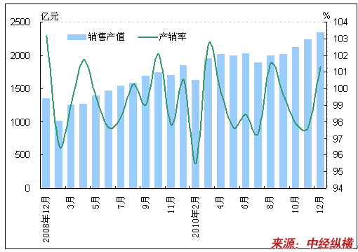 2008年12月-2010年12月我国炼油业销售产值和产销率