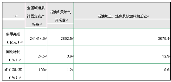 2010年全年,我国油气开采业固定资产投资增速前扬后抑,上半年稳步增长,下半年平稳回落。全年投资额达2892.5亿元,同比增长3.6%,增速比上年同期下降0.8个百分点,比前三季度下降3.8个百分点。2010年全年投资增速下降是2009年油气开采业固定资产投资额快速回升的合理回调。我国油气 行业 发展迅速,勘探领域和地区广泛,尤其是页岩气、煤层气等非常规能源储量较为丰富。随着金融危机的结束和需求的增加,我国油气开采业的重要地位进一步凸显,同时也必将刺激固定资产投资的持续增长。