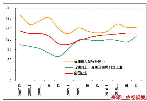 石油加工、炼焦及核燃料加工业景气指数由降转升,达128.3,比全国企业景气指数低近10点,比上年同期增加11.8点,比2010年三季度下降16.5点,一举从“相对景气区间”跃升至“较为景气区间”。2010年四季度,国际原油价格大幅上涨,发改委两次适时调整成品油价格,有利于保障炼油企业稳定盈利。