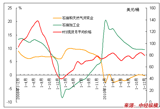 石油 行业 的增加值增速与国际原油价格关系非常密切。2008年下半年爆发的金融危机造成国际油价暴跌,也严重影响了石油 行业 的增加值增速,油气开采业和炼油业增加值都一度出现负增长。2009年以来,随着国际油价的逐渐走高,两个子 行业 增加值随之回升。炼油业更是由于国家实施新的成品油定价机制,并根据这一机制适时调整成品油价格,极大的促进了炼油业增加值的提升。不过,原油价格继续波动上涨以及通胀预期加大的时候,如果国内成品油价格做不到适时上调,这对炼油业来说也是一种“灾难”,2010年下半年大致就是这种情况,因此炼油业增加值高位回落。