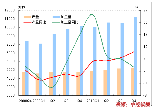 2008年4季度-2010年4季度我国原油产量和加工量及其同比增长率比较