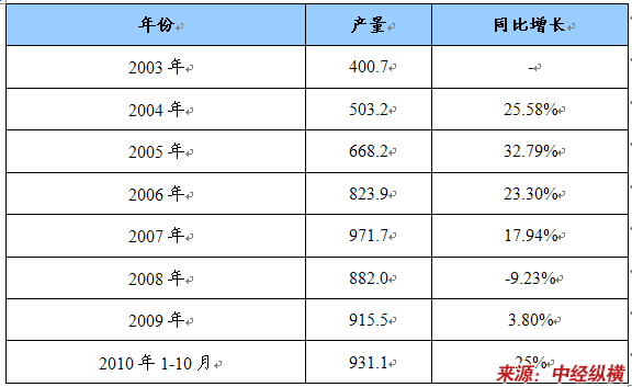 2003年-2010年我国PVC产量 单位:万吨,%