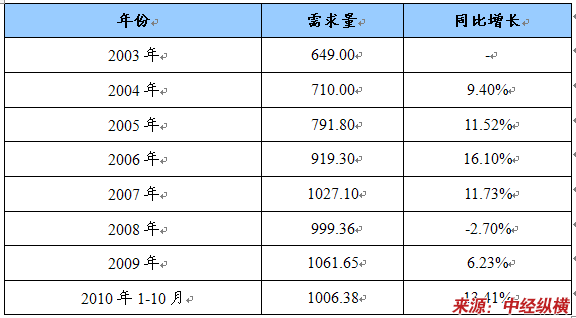 2003-2010年PVC需求量及同比增长统计表 单位:万吨
