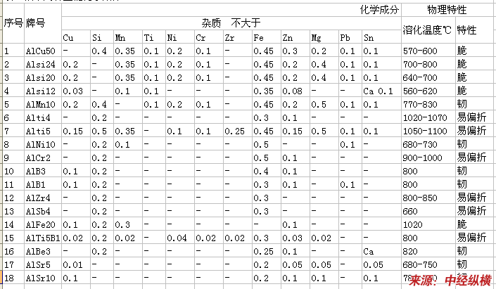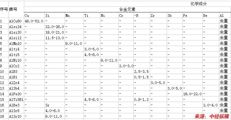 铝中间合金主要用来调整铝熔体成份的一种传统产品,它是一些融化温度较高的金属元素,用熔融法和铝生产中间体,这种中间体的熔化温度显著降低,从而使一些熔解温度较高的金属元素在较低的温度下加入到铝液当中,以调解铝熔体的元素含量。