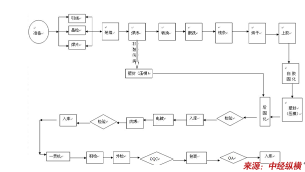 芯片测试—与引线框架组装—烧结—酸洗—上胶—烘烤—塑封—后固化—电镀—印字测试—外检—包装—QA检验—入库—发货。