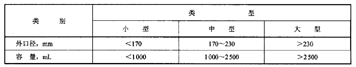 产品按其外口径或容量分为小、中、大型,其规格尺寸见表。外口径与产品高度之比≥2时,以外口径确定其类型;外口径与产品高度之比<2时,以容量确定其类型。