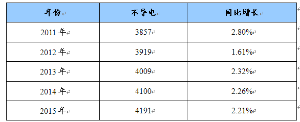 2011-2015年阻水带(不导电)产品需求预测 单位:吨