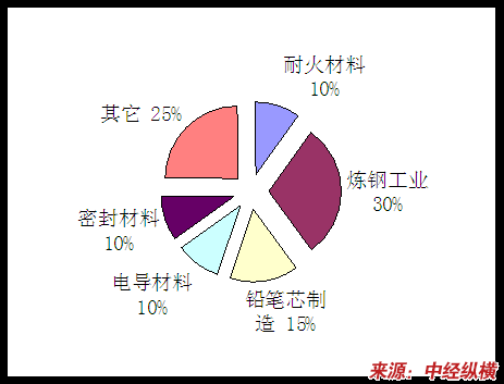但中国天然石墨消费目前仍处于低水平状态,其主要消费领域为:钢铁和铸造业、耐火材料、电导材料、铅笔芯、化工及汽车制造方面的石墨密封材料。目前中国石墨消费结构大体上是:耐火材料10%,炼钢工业30%,铅笔芯制造15%,电导材料10%,密封材料10%。此外,显像管石墨乳、拉丝石墨乳、模锻石墨乳、节能添加剂及其他25%。