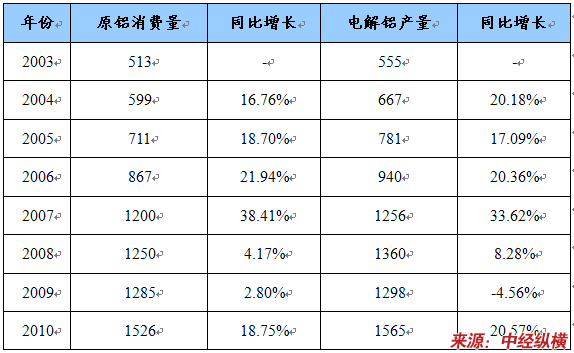 2003-2010年中国电解铝产量、铝消费量统计 单位:万吨