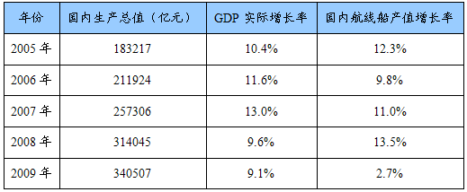 说明:国内生产总值及其增长率均来源于国家统计局修正后的数据,国内航线船产值增长率是按照国内航线船产量*不变价格计算产值,因此产值增长率和产量增长率相当。