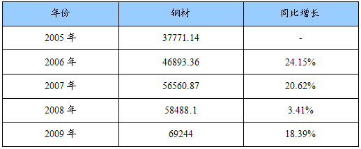 2007年时钢材价格走势的均价为4100多元/吨,2008年钢材价格走势为5000元/吨左右。2009年的钢材价格走势平均约为4355元/吨。
