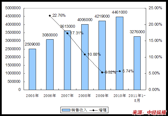 我国胶粘带产量从2005年的73.0亿m2增加至2009年的125亿m2,增长了71.23%,年均增长率为14.57%,销售额从2005年的132亿元增加至2009年的237.0亿元,增长了79.55%,年平均增长率为15.75%,分别高于“十一五” 规划 规定增长率11% 和12%的指标。