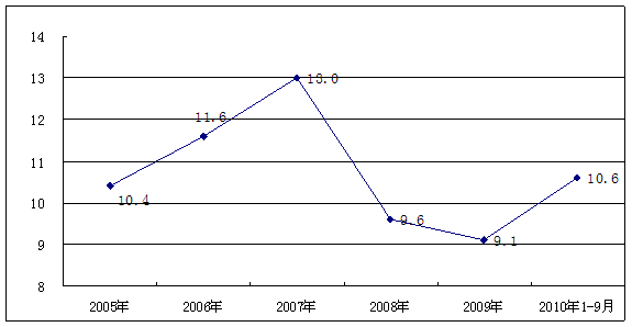 中国为工业主导型经济,经济发展情况主要取决于第二产业的发展情况。2009年全年规模以上工业增加值比上年增长11.0%,增速比上年回落1.9个百分点。其中,一季度增长5.1%,二季度增长9.1%,三季度增长12.4%,四季度增长18.0%。工业增加值增速逐步加快,表明在政府经济刺激计划的带动下工业正稳步好转。从各 行业 表现看,受政府投资强力拉动以及国际市场基础资源价格大幅反弹的影响,黑色金属、非金属、其他矿采选业等资源开发类 行业 处于相对较高水平;而食品、纺织、化学原料制造等轻工业业绩增长则相对平缓。值得关注的是,以水泥、钢铁等为代表的非金属矿物制品业、黑色金属冶炼及压延加工业,产能过剩依然明显,其生产增速的集中大幅提高有可能导致相关产品价格未来面临进一步下行压力。