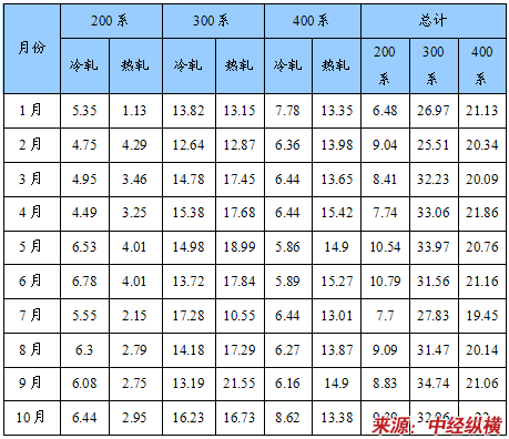 2010年10月全国主要钢厂不锈钢(太钢、太钢天管、宝钢、宝新、张家港浦项、广州联众、酒钢、上海克虏伯、泰山钢铁、唐山钢铁、西南、东方振石)总产量66.85万吨。其中热轧32.66万吨;冷轧34.19万吨。