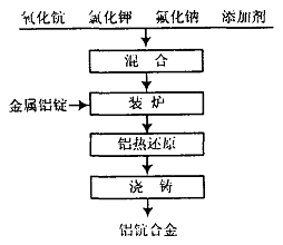 黄美松选取KC1-NaF熔盐体系,以图l的工艺流程,采用最佳还原条件为温度950K,时间为90min、Sc3O3,的质量分数为3.7%,制取了lt含铝钪(2%)合金,合金中钪含量稳定在2.1%-2.2%,钪的回收率达92%。