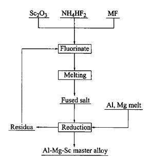对掺法原理简单,对设备要求低。但鉴于钪与铝的熔点相差很大(A1:660'℃,Sc:1541℃),铝熔体需过热到较高温度,很难配制出成分稳定、分布均匀的中间合金产品,且金属钪的烧损严重。