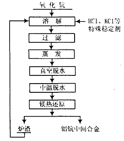 姜锋等提出氯化钪-铝镁热还原法制备铝钪中间合金。其原则工艺流程见图2。该法的要点是以非高纯Sc2O3作原料,经盐酸溶解转变为含ScC13的溶液,再经蒸发,真空脱水及中温加热制备ScC31的熔盐,然后在900℃温度下,将熔盐置于熔融的铝镁合金液中。此时,ScC13被金属镁还原为金属钪,金属钪被铝液捕集,以Al3Sc形式生成化合物,制备A1-Mg—Sc中间合金。