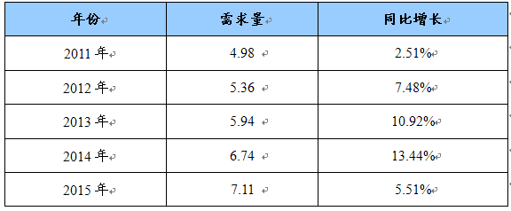 2011-2015年穿孔机顶头需求量及同比增长预测表 单位:万吨