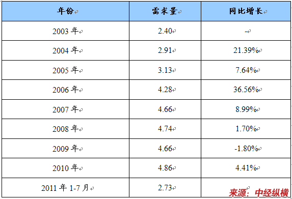 2003-2011年7月穿孔机顶头需求量及同比增长统计表 单位:万吨