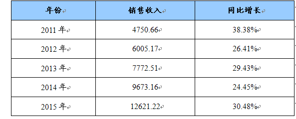 2011-2015年南北干货销售收入及同比增长预测表 单位:亿元