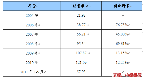2003-2011年5月水平井、定向井、钻井装备及器具销售收入及同比增长统计表 单位:亿元