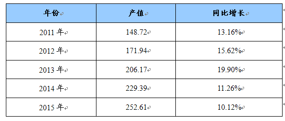 2011-2015年钻采装备产值及同比增长预测表 单位:亿元