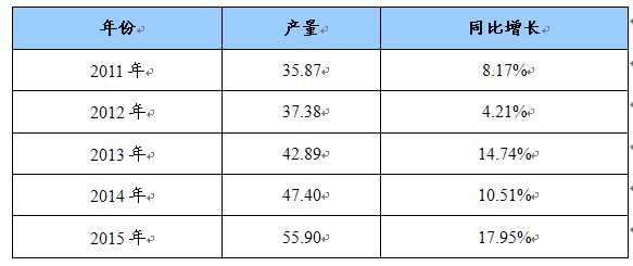 2011-2015年塑料阀门产量及同比增长预测表 单位:万吨