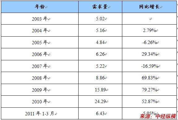 2003-2010年塑料阀门需求量及同比增长统计表 单位:万吨