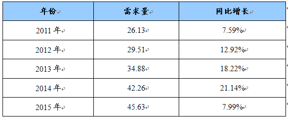 2011-2015年塑料阀门需求量及同比增长预测表 单位:万吨