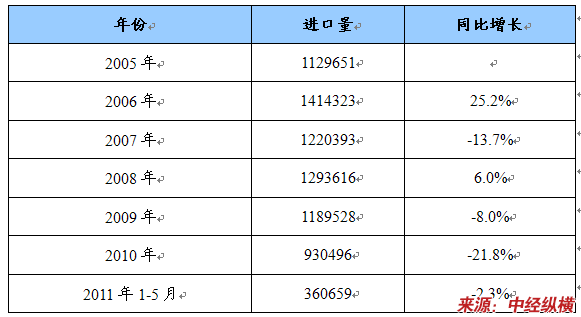 2005-2011年5月塑料阀门进口量及同比增长统计表 单位:套