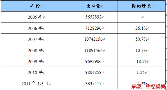 2005-2011年5月塑料阀门出口量及同比增长统计表 单位:套