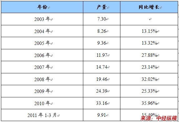 2003-2010年塑料阀门产量及同比增长统计表 单位:万吨