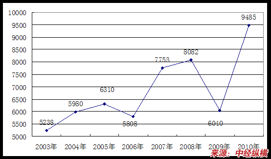 受全球棉花供给减少趋势影响,溶解浆价格逐年走高,呈现供不应求,2010年中国溶解浆产品平均售价比上年同期上涨3445元/吨。