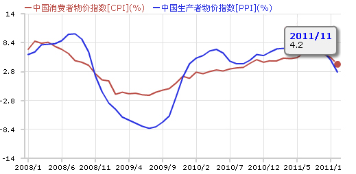 2011年11月份,全国居民消费价格总水平同比上涨4.2%。其中,城市上涨4.2%,农村上涨4.3%;食品价格上涨8.8%,非食品价格上涨2.2%;消费品价格上涨5.0%,服务项目价格上涨2.4%。全国居民消费价格总水平环比下降0.2%。其中,城市下降0.2%,农村下降0.2%;食品价格下降0.8%,非食品价格上涨0.1%;消费品价格下降0.2%,服务项目价格下降0.3%。1-11月平均,全国居民消费价格总水平比去年同期上涨5.5%。