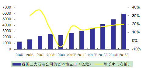 1、油气开采投资保持高速增长。自2003年以来,国内石油和天然气开采固定资产投资保持高速增长。由于国内油气开采主要集中在中石油、中石化和中海油三大公司,因此他们的资本性支出说明了油气开采投资的趋势,根据预测,我国三大石油公司的资本性支出在未来2011-2015年中的CAGR达19.8%。
