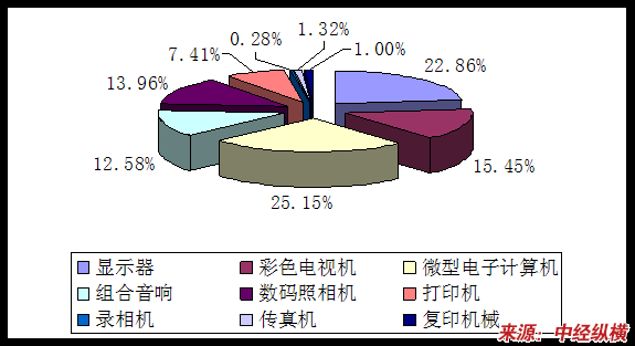FFC排线主要用于数码产品中,如显示器、彩色电视机、微型电子计算机、组合音响、数码照相机、打印机、录相机、传真机、复印机械等领域。在排线的消费结构中,显示器、彩色电视机以及微型电子计算机的应用比例最大,占总量的50%以上,复印机械中应用最少,仅为1%。