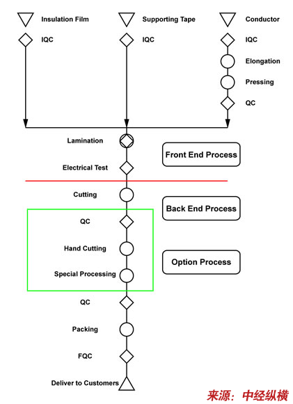 制作工序:从压延机开始制作导体(镀锡铜线)导体的宽,窄和厚度根据订单的要求有所不同,制作完成导体后放入FFC设备的放线架(SPOOLDIE)上将导体放入FFC主体设备来带动经过设备后将半成品进行vision测试(检测导体的优良性)在经过裁切机(根据订单的要求裁切的长度也有所不同)经过这样一系列的繁杂程序最终生产FFC柔性扁平电缆线。因实际操作比较困难需要长期的与这些设备接触才能达到如火纯情的地步。根据实际操作者的水平制作出来的FFC排线优良性也有所差异。