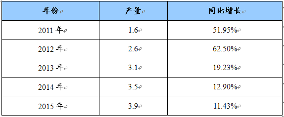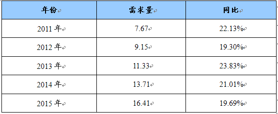 2011-2015年我国非晶带材需求量预测表 单位:万吨