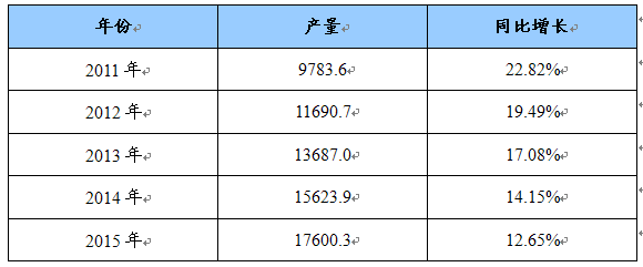 2011-2015年我国发动机隔热垫产业规模及增幅预测表 单位:吨