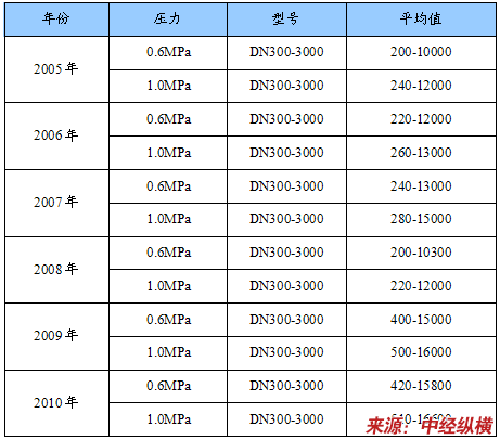 2005年-2010年全国中心城市玻璃钢加砂管道平均价格