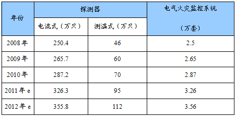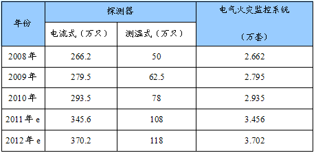 2008-2012年我国电气火灾监控系统需求量及预测表
