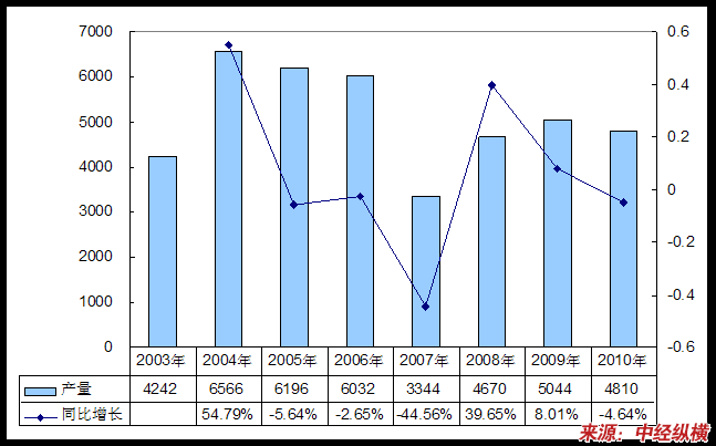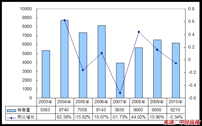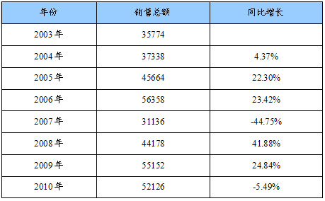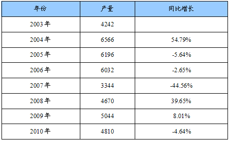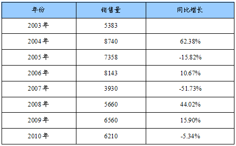 2003—2010年我国气候环境试验设备产量总体较为平稳,2003年有较大幅度的提高,之后的两年时间内有缓慢的下降,2007年出现了大幅下降;2008-2009年得以恢复,到2010年又出现下降,2003—2010年我国气候环境试验设备的需求总体处于不稳定状态,2004年的需求最大,05年出现下滑,06年又有所增加,但07年出现了明显的下滑,到2010年销量达到6210台;消费方面,2003年以来,整体处于增长状态。预计未来3到5年,产量及市场需求都呈现平稳增长趋势,消费会随着价格的上涨而呈现明显的上涨趋势。