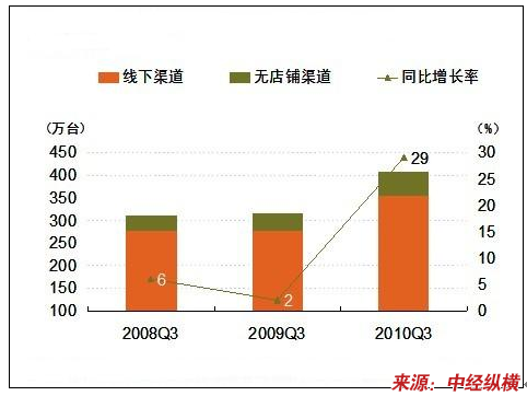 全国零售推算数据显示,2010年第三季度全国男用电动剃须刀全国整体零售市场(全国整体零售市场包括:线下渠道和无店铺渠道)销量在408万台左右,同比增长29%,环比增长10%,其中,代表传统零售市场的线下渠道的零售销量在 354万台,新兴无店铺渠道(无店铺渠道包括:电视购物,网络购物,目录营销)的零售量54万台。值得关注的是,无店铺渠道同比增长达35%,它的同比攀升带动了整体市场的走高,是市场的新一轮关注点。