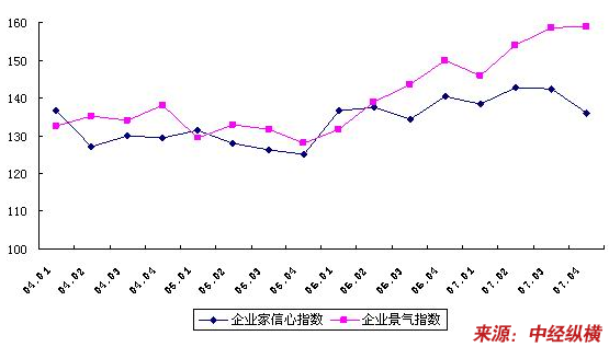 2007年以来,我市经济总体保持平稳较快的发展态势,消费品市场活跃,奥运经济效应逐步显现,企业运行质量明显改善。据四季度企业景气调查结果显示:2007年我市企业景气指数逐季攀升,从145.8、153.8、158.5增长到158.7点,屡创历史新高。在宏观调控和从紧货币政策预期影响下,企业家对经济判断持谨慎态度,信心指数有所回落,四季度为136.1,比上期和去年同期分别回落了6.2和4.3点,但是仍然运行在“较为景气”区间。
