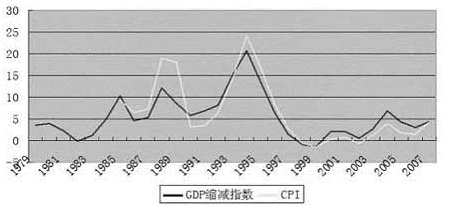 1979-2007年GPD缩减指数和CPI年度增长率变化趋势