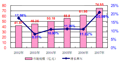 2002-2007年我国糖尿病用药市场规模及增长率