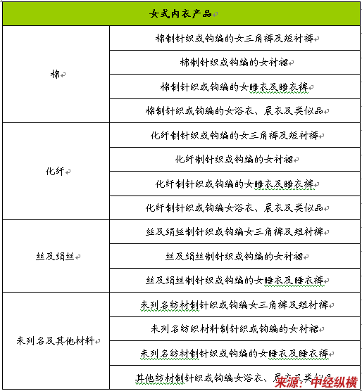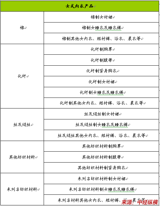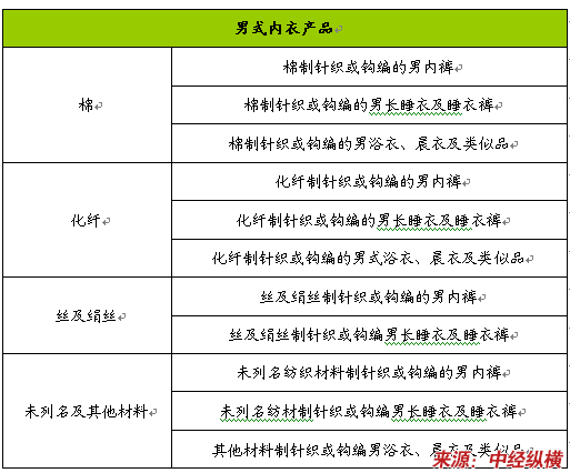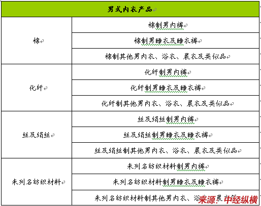 在借鉴国家统计机关统计实践分类的基础上,本报告首先根据制作工艺的不同分为针织和钩编类、非针织和非钩编类两大类内衣,同时,将内衣按品种分为内裤(男女性三角裤及短衬裤)、睡衣(包括长睡衣和睡衣裤)、胸罩、胸衣、腹带、其他内衣、浴衣、晨衣和类似品、女衬裙等,在此基础上,又根据其纺织面料的不同对其加以细分。