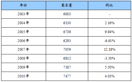 2003-2010年我国墙布(壁布)需求量统计